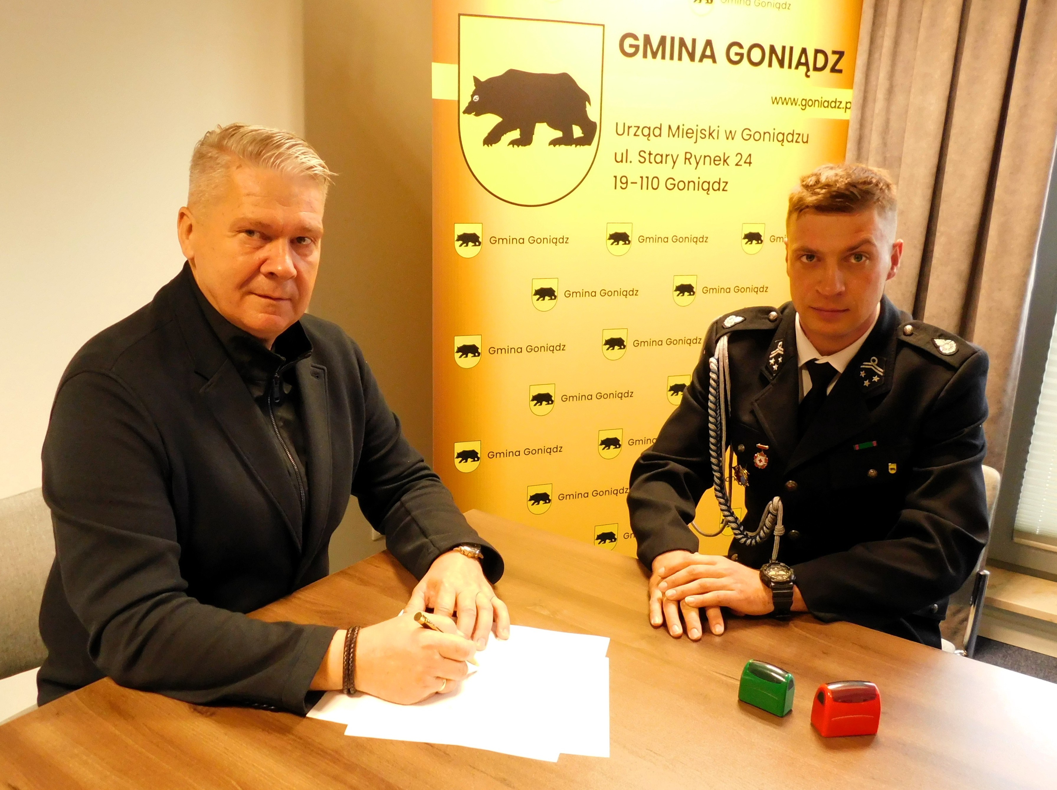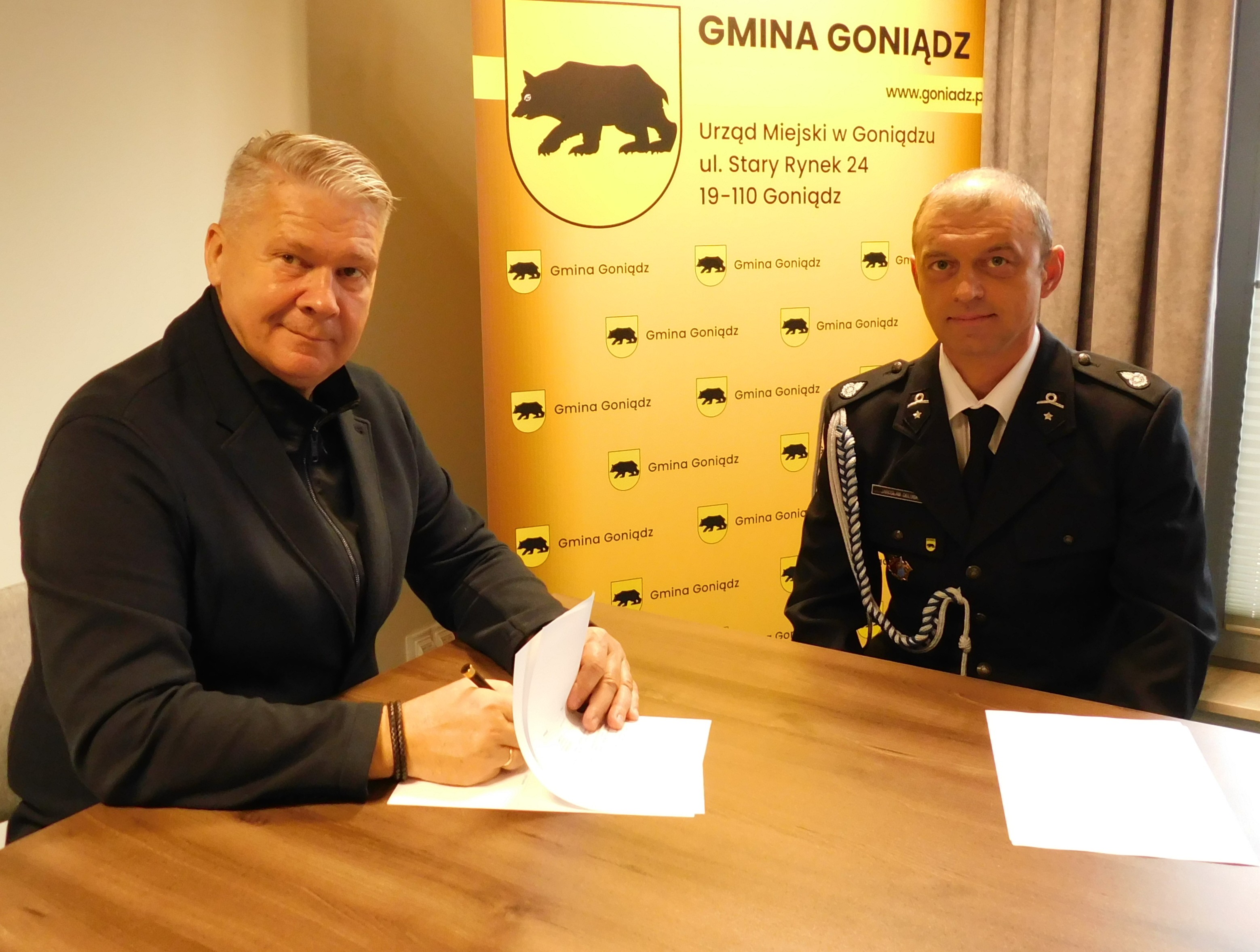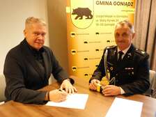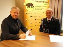 Burmistrz Goniądza Grzegorz Andrzej Dudkiewicz oraz Skarbnik Miejski Jolanta Gorzoch podpisali umowy z jednostkami Ochotniczych Straży Pożarnych z terenu Gminy Goniądz: OSP w Goniądzu, OSP w Downarach oraz OSP w Osowcu, dotyczące dofinansowania zakupu sprzętu ratowniczo-gaśniczego oraz umundurowania.