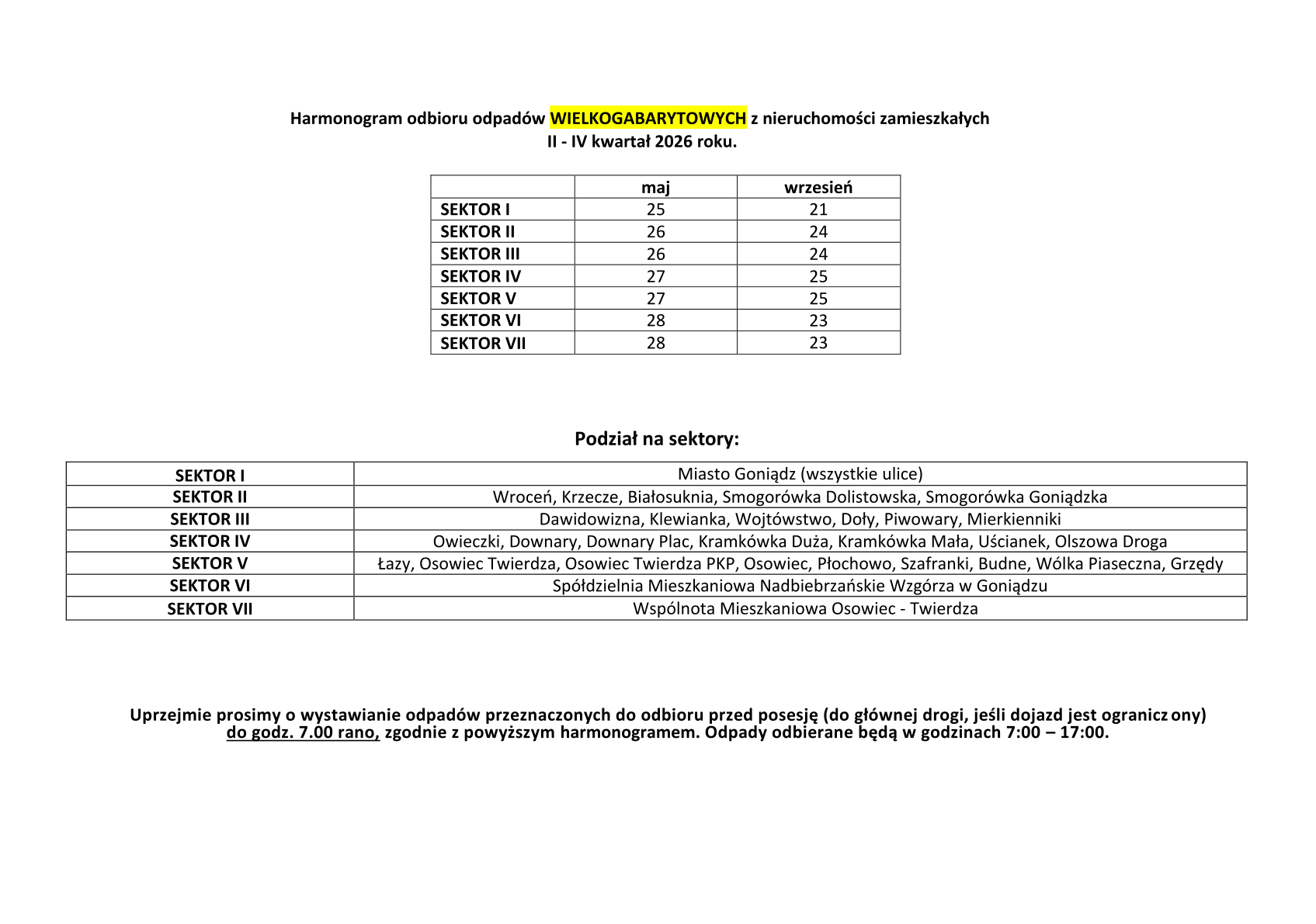 Wskazany termin odbioru w październiku jest nieprawidłowy. Odbiór odpadów wielkogabarytowych odbędzie się we wrześniu, przy zachowaniu tych samych dni odbioru.