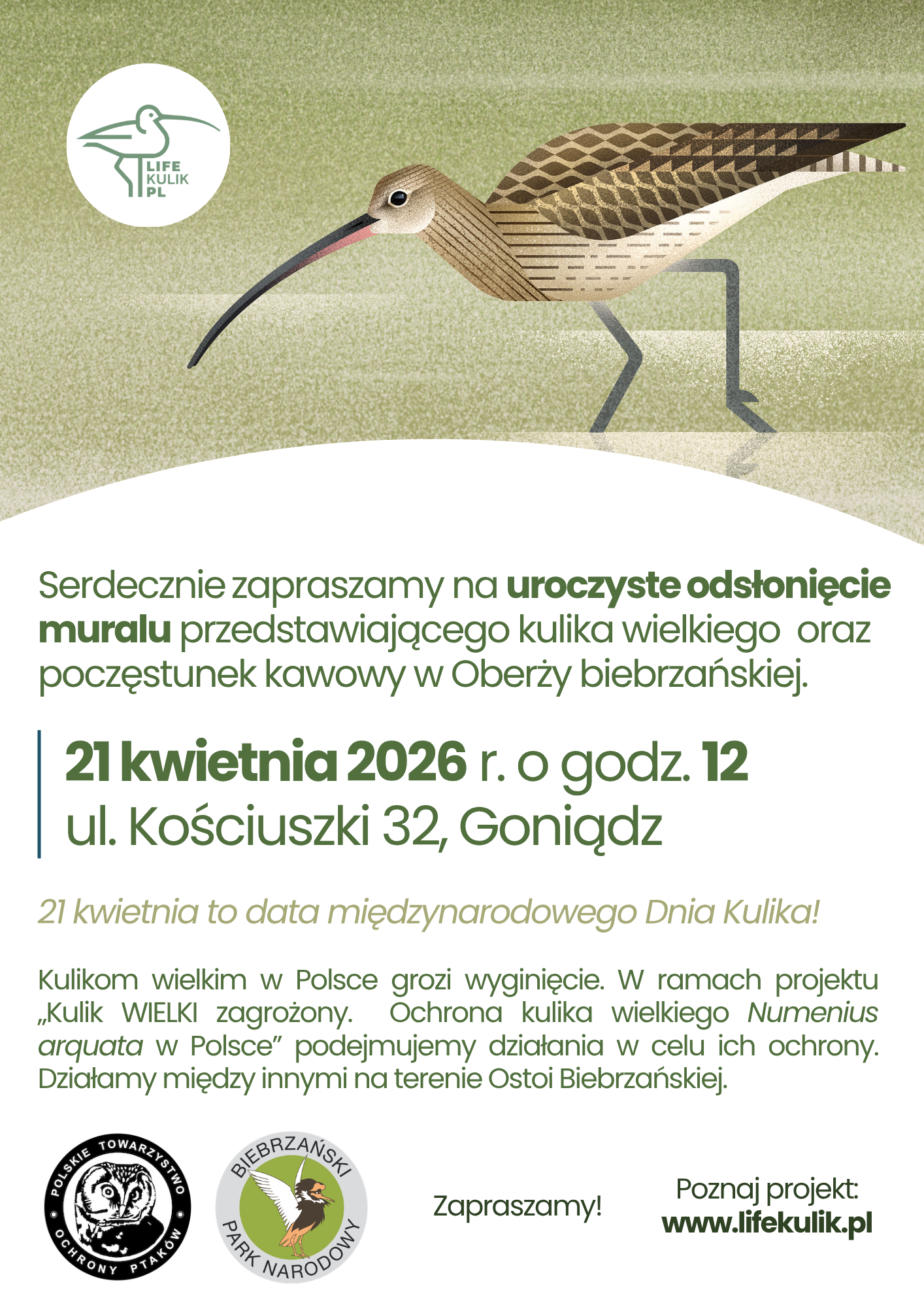 Zaproszenie na odsłonięcie muralu kulika wielkiego - Kościuszki 32, Goniądz